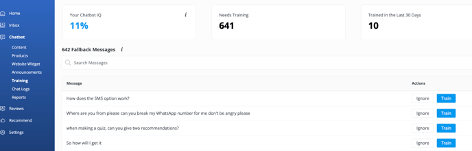 All fallback-triggering messages are saved in the Training section under “Messages”. You can review these to identify gaps in your ChatBot’s knowledge and begin training it to respond more effectively in the future.