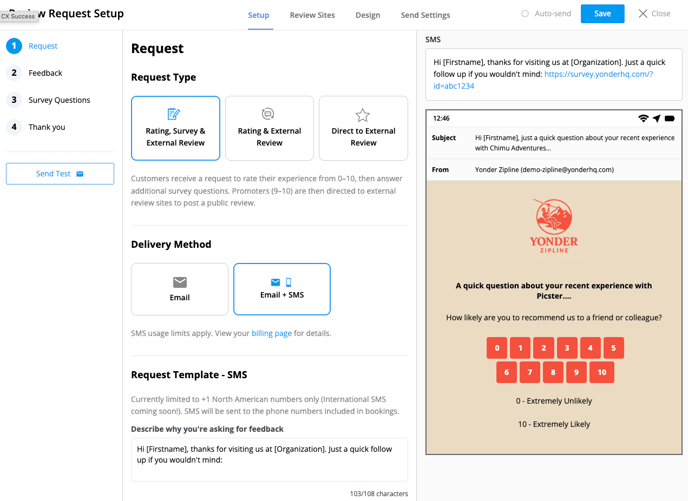 Note: SMS requests will only be sent if a valid +1 North American mobile number is available in the booking. International SMS is not yet supported.
