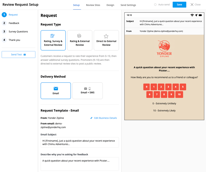 Yonder’s Reviews product is your all-in-one solution for automating customer feedback! Achieve high response rates by sending engaging review requests and surveys. This guide walks you through the essentials of setting up surveys and review requests in a few simple steps.