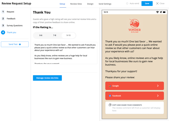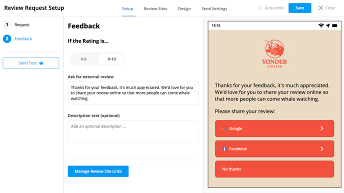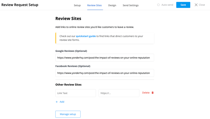 Use the Review Sites tab to add links to the platforms where you’d like customers to leave public reviews.
