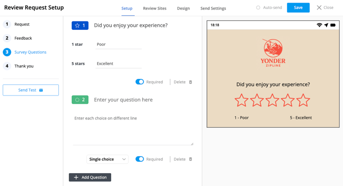 This step appears only if your request type is Rating, Survey & External Review. Add custom survey questions to collect more detailed feedback from your guests: