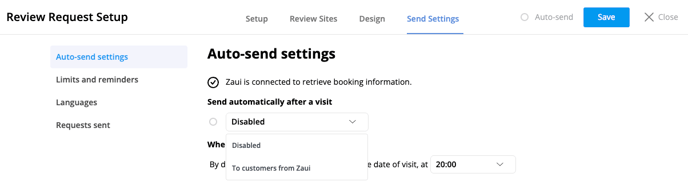 - Adjust Send Setting: In the ‘Send Settings’ tab, configure the timing of review requests, set up reminder emails, control limits for returning customers, and enable multiple languages.
