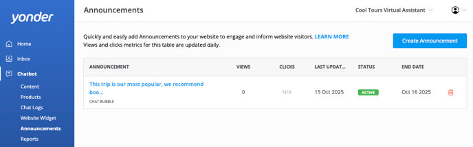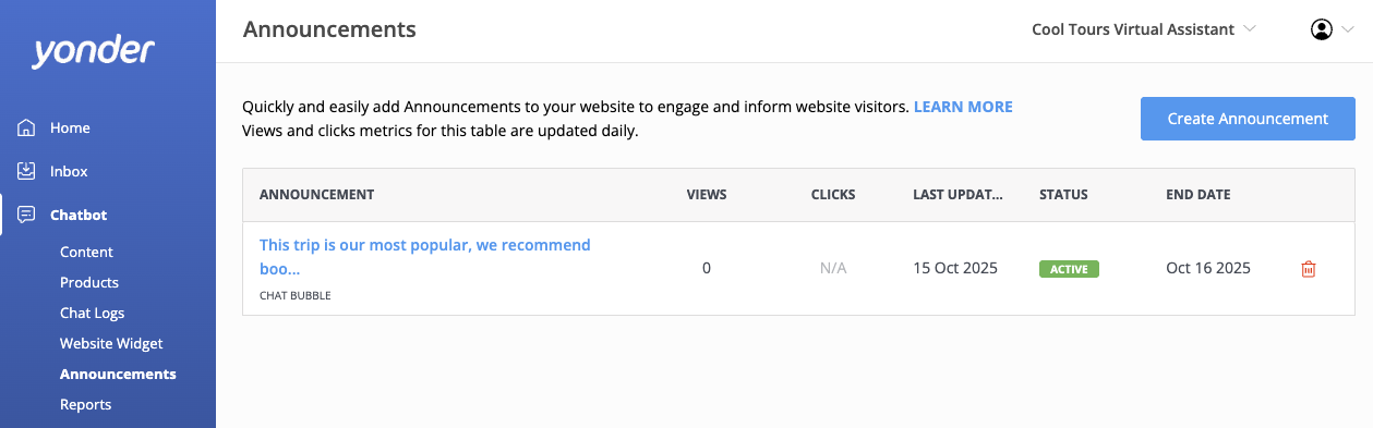 - Log in to your Yonder dashboard, navigate to the Chatbot tab, and click on Announcements.
