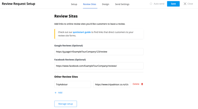 Other Review Sites - click Add to include platforms like Tripadvisor, Bookme, GetYourGuide, etc. Be sure to add a clear label for each.